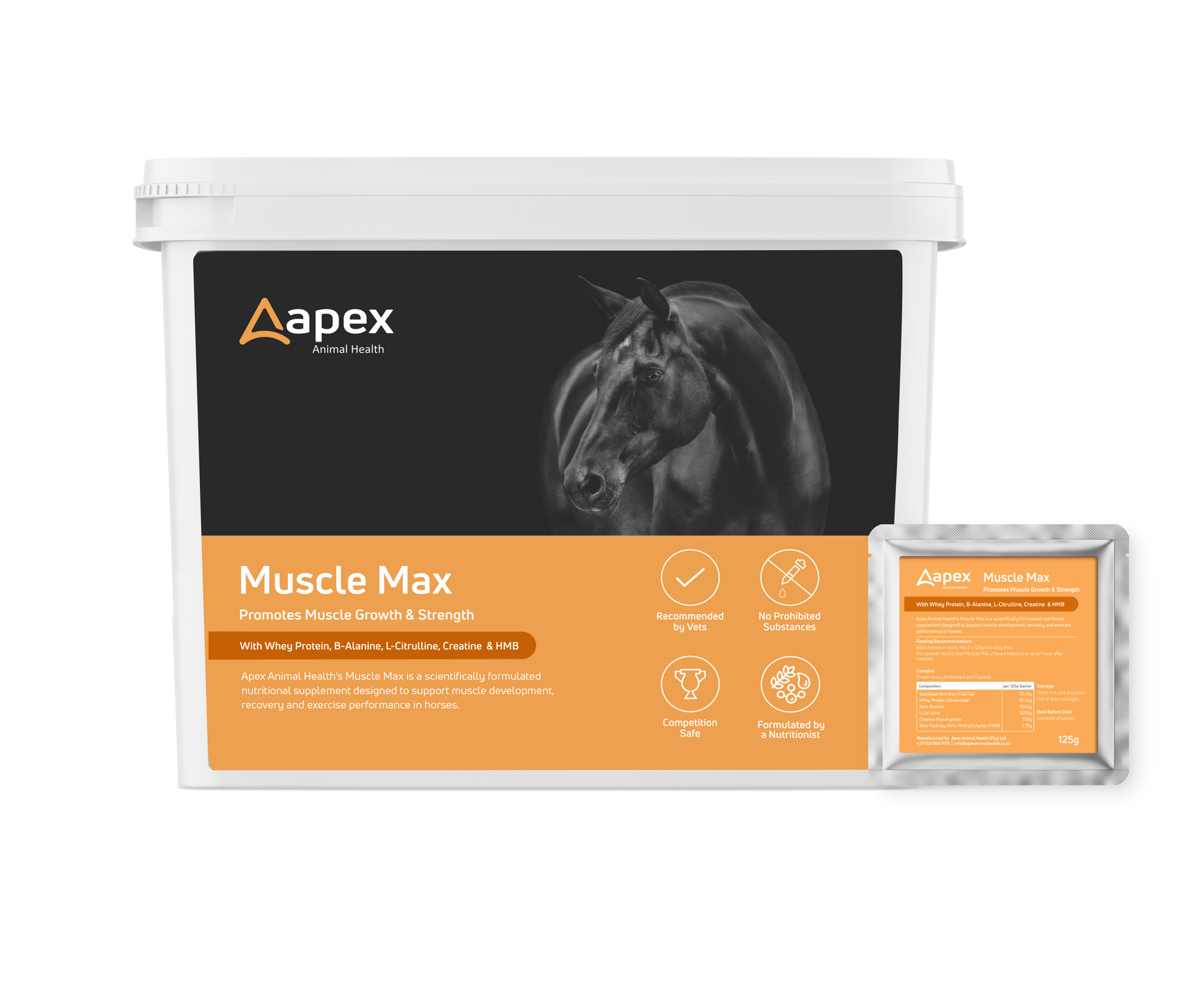 Apex Animal Health’s Muscle Max is a scientifically formulated nutritional supplement designed to support muscle development, recovery and exercise performance in horses. A combination of ingredients work synergistically to optimize muscle protein synthesis, reduce muscle breakdown associated with intense exercise, and support oxygen and nutrient delivery to muscles post workout, improving tolerance to exercise and therewith recovery. This supplement is ideal for performance horses, young developing horses, and those in rehabilitation.