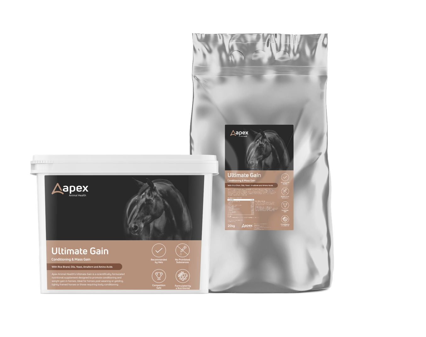 Apex Animal Health’s Ultimate Gain is a scientifically formulated nutritional supplement designed to promote conditioning and weight gain in horses. Ideal for horses post weaning or gelding, lightly framed horses or those requiring body conditioning. This nutrient-dense formula optimizes caloric efficiency while balancing feeding rates. Carefully selected ingredients enhance weight gain, improve muscle deposition and support digestive and metabolic health.
