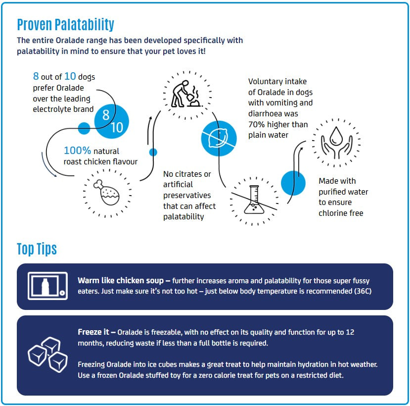 Oralade® GI+’s incredible tasting formula is the result of a highly hydrolysed 100% natural chicken flavour, making it ideal for use in all carnivorous species including dogs and cats with gastrointestinal sensitivities.