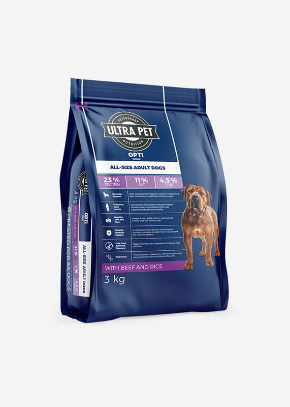Our Ultra Dog food is available in 3kg, 8kg bags. Optiwoof Adult with Beef and Rice is a complete and balanced food that assists with maintaining strong muscles, a healthy digestive system, and healthy teeth and bones.