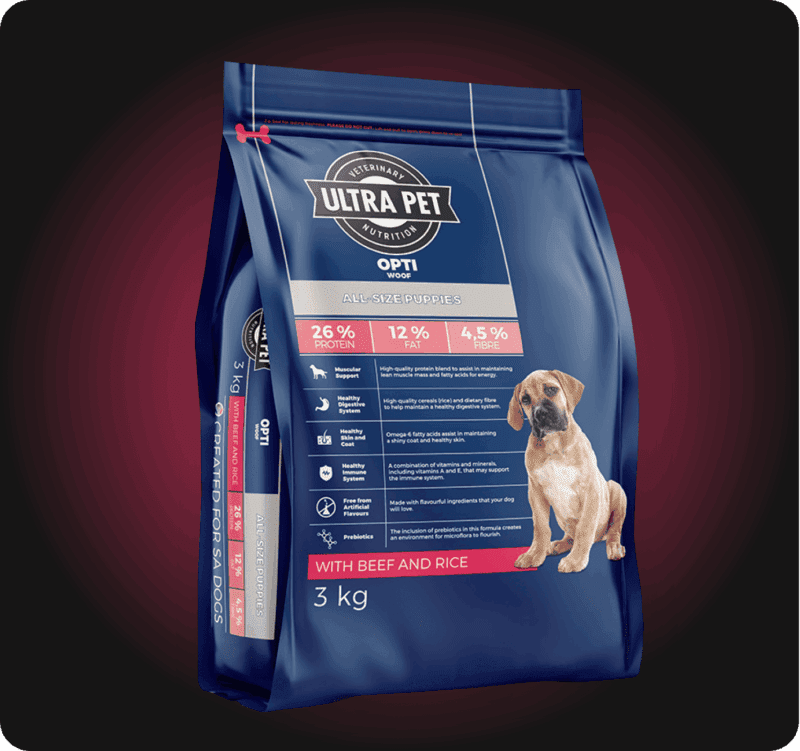 Help your pup live an ultra-great life! We can assure you that you’ll get some of the best puppy food South Africa has to offer when you choose the Optiwoof range. Ultra Pet understands that your puppy’s good health is reflected in the way they look, feel, and develop – it’s in their strong muscles, high energy levels, shiny coat, and healthy skin. This super healthy puppy food has been developed by our resident veterinarian and animal nutritionist. It is suitable for all breeds and will deliver the required levels of protein and fat to help your pup develop into a healthy, active adult dog. Our new range has been formulated with the inclusion of prebiotics, a plant-based fibre that helps to improve intestinal and digestive system health.
